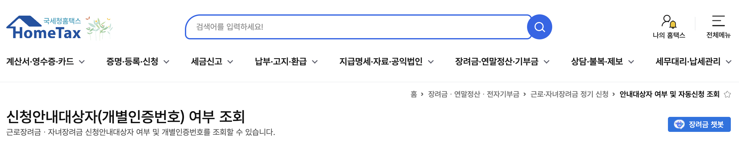 근로장려금 신청 가능여부는 개인에게 고지되며 홈텍스 홈페이지를 통해 대상여부를 확인하실 수 있습니다.