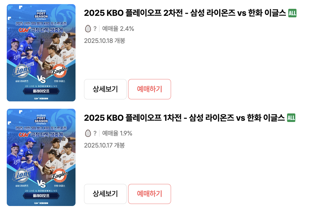 CGV 플레이오프 티켓 예매하기 생중계 삼성 한화