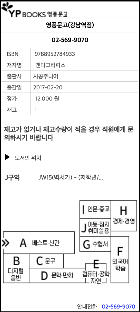해당 도서의 재고가 있는 영업점이 출력되는데, 영업점 이름 밑의 숫자를 눌러보시면 왼쪽과 같이 지점의 전화번호와 재고가 어디에 위치해 있는지까지 상세하게 검색해 보실 수 있습니다.