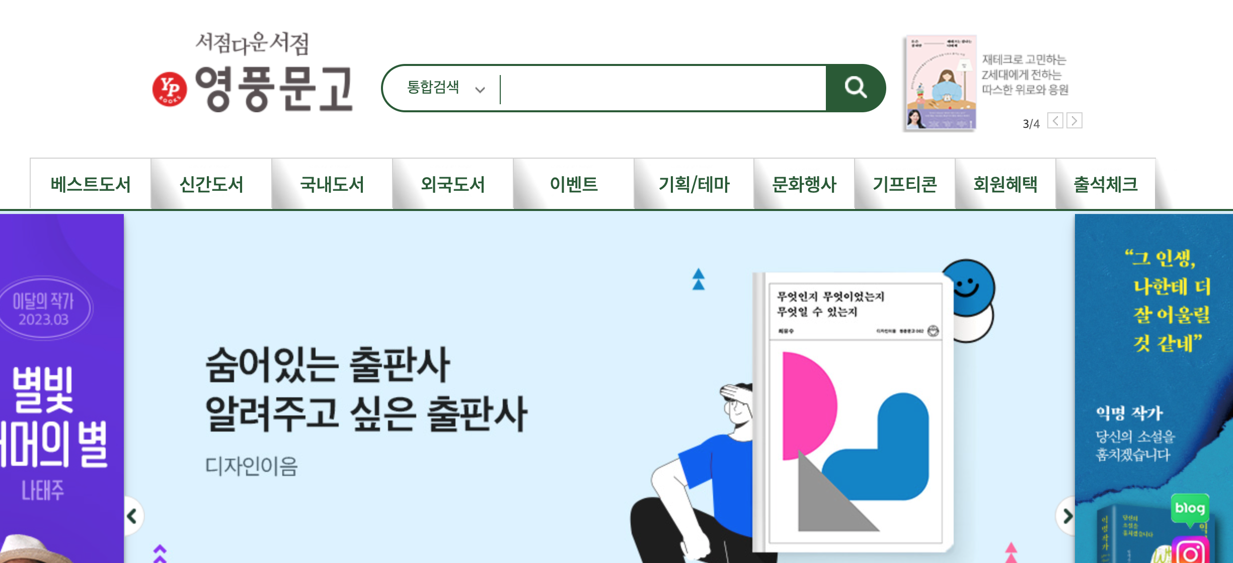 먼저 영풍문고 인터넷 홈페이지에 접속합니다. 모바일로도 접속이 가능하기 때문에 아래의 URL을 클릭하시면 쉽게 영풍문고 사이트로 이동하실 수 있습니다.