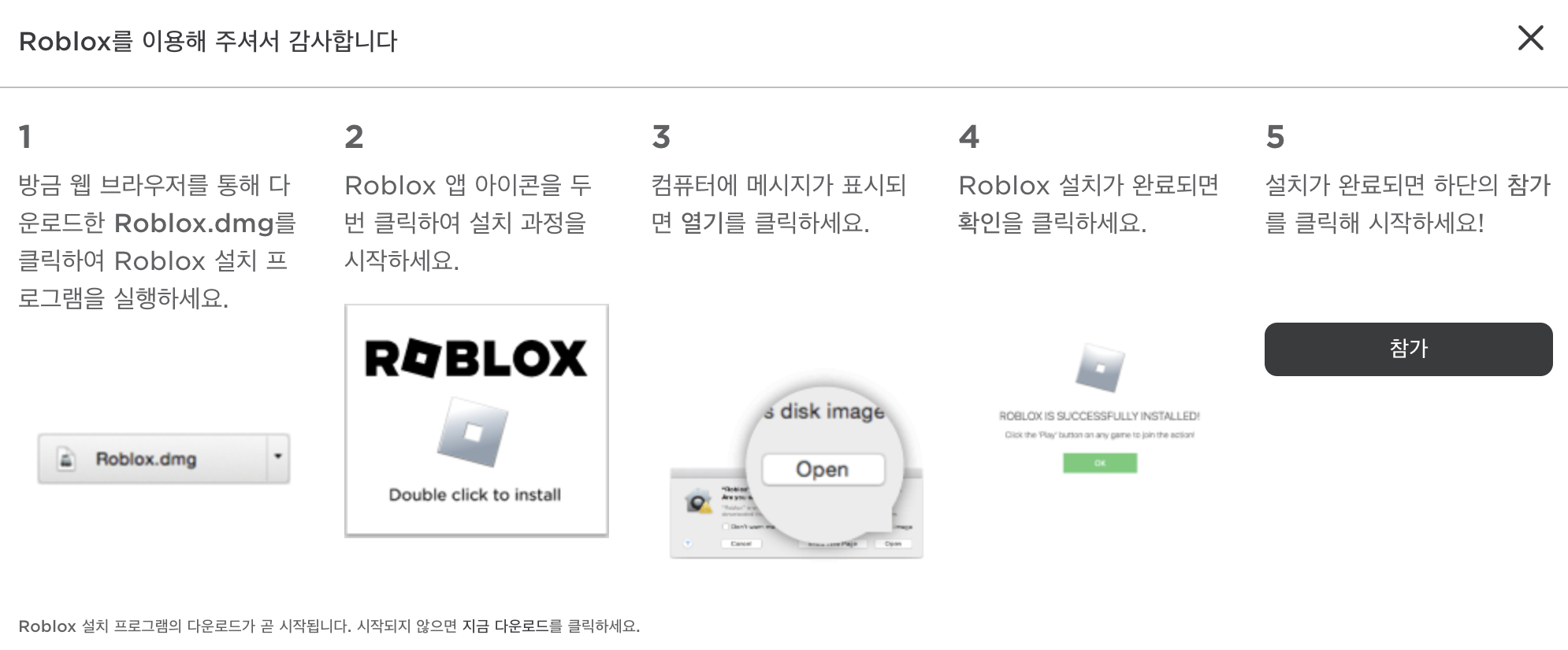 로그인을 하고 나면 로블록스를 다운로드 할 수 있는 창이 뜨게 됩니다. 아래와 같은 안내가 나오게 되는데 설명대로 Roblox.dmg파일을 클릭하여 설치하면 됩니다. 바로 설치하실 분들은 아래의 파일을 클릭하셔서 설치하셔도 됩니다.