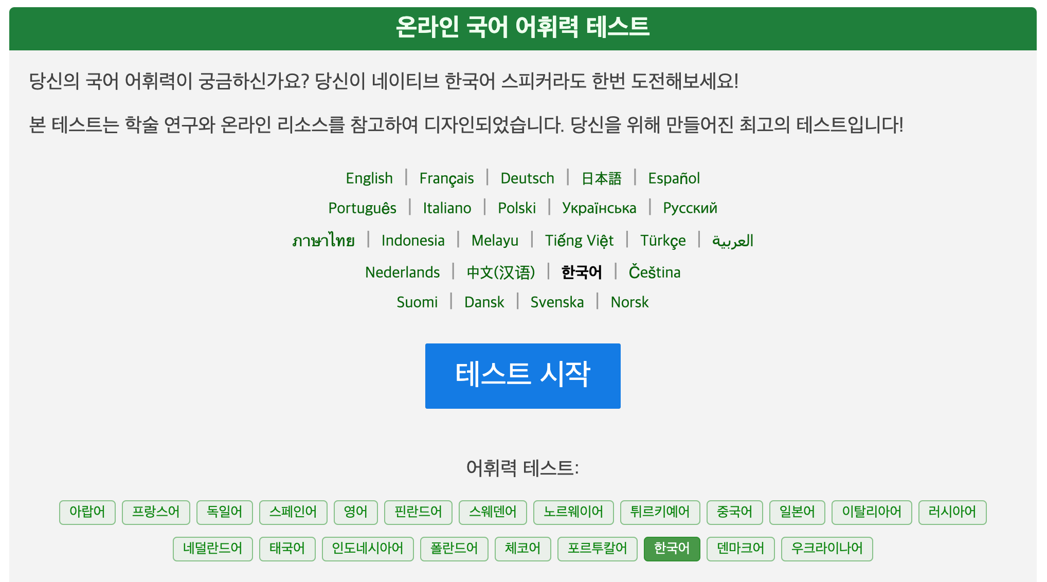 위 사이트에 들어가시면 한국어 뿐만 아니라 영어나 프랑스어, 독일어와 같은 다른 나라 언어의 어휘력도 테스트할 수 있습니다. 테스트는 처음에는 쉬운 것 같지만 뒤로 갈수록 점점 더 어려워지기 때문에 의외로 당황스러운 문제들도 접하게 됩니다.