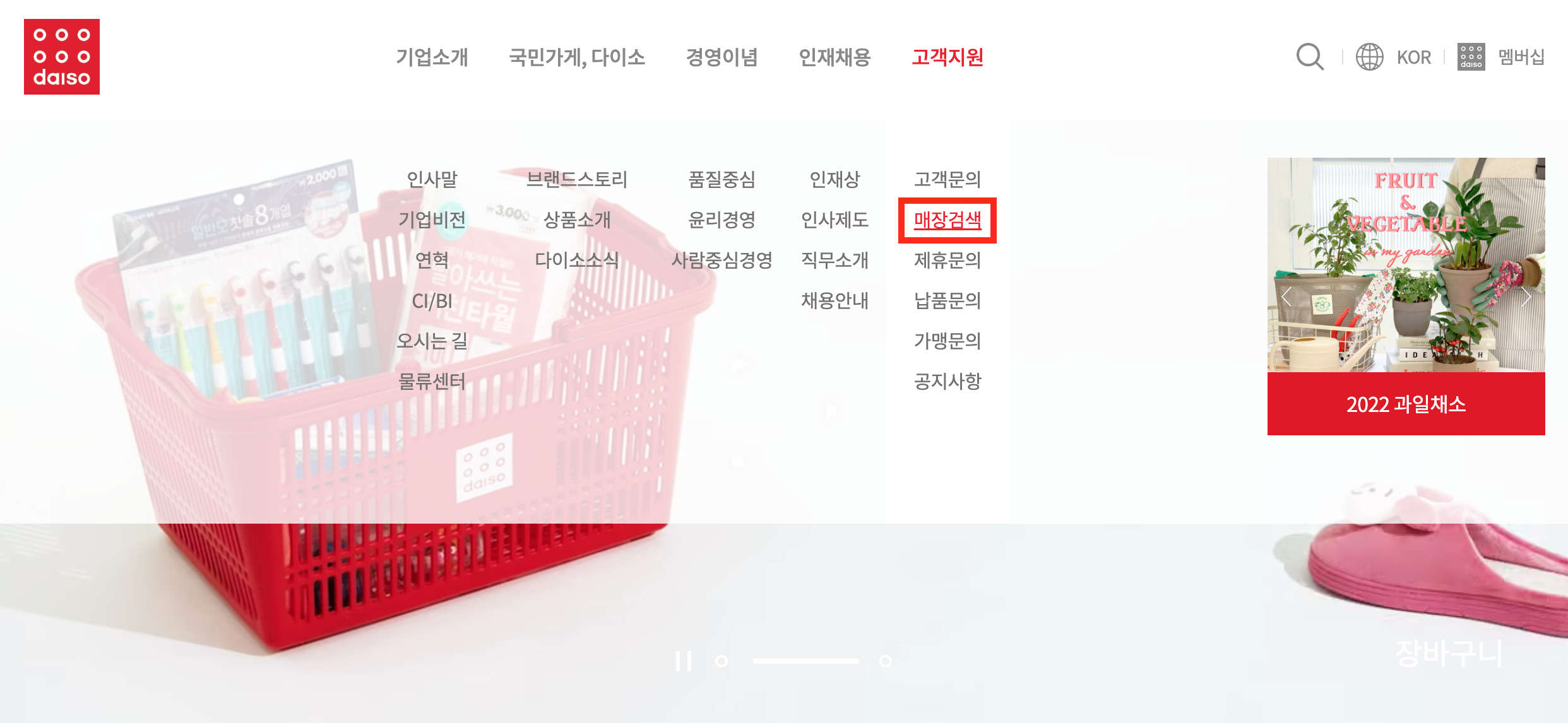 다이소 매장을 찾는 방법은 간단합니다. 다음의 URL을 통해 다이소 홈페이지로 들어가면 쉽고 빠르게 다이소 직영점 및 다이소 매장을 찾을 수 있습니다.