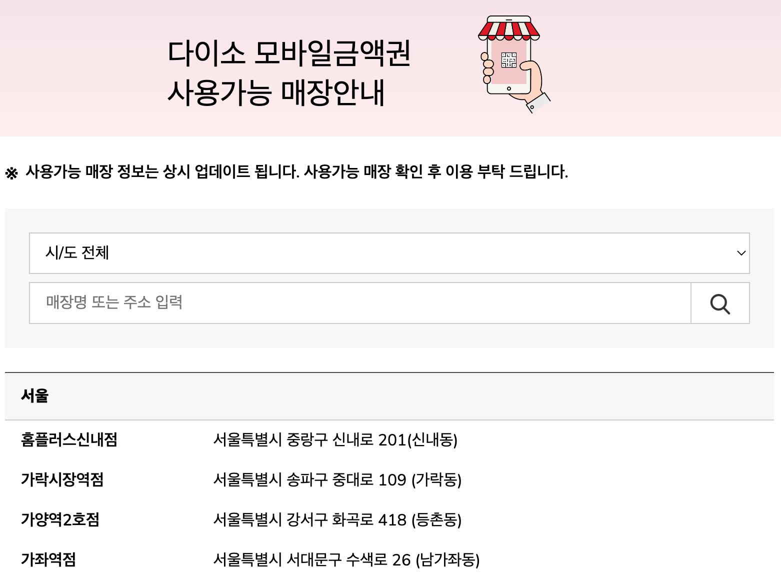 다이소 모바일 금액권을 사용할 수 있는 다이소 직영점은 위의 링크를 통해 찾아보실 수 있습니다. 원하는 지역을 선택하신 후, 바로 아래 돋보기 아이콘을 누르시면 해당 지역에서 다이소 모바일 금액권을 사용하실 수 있는 직영점 리스트가 보이게 됩니다.