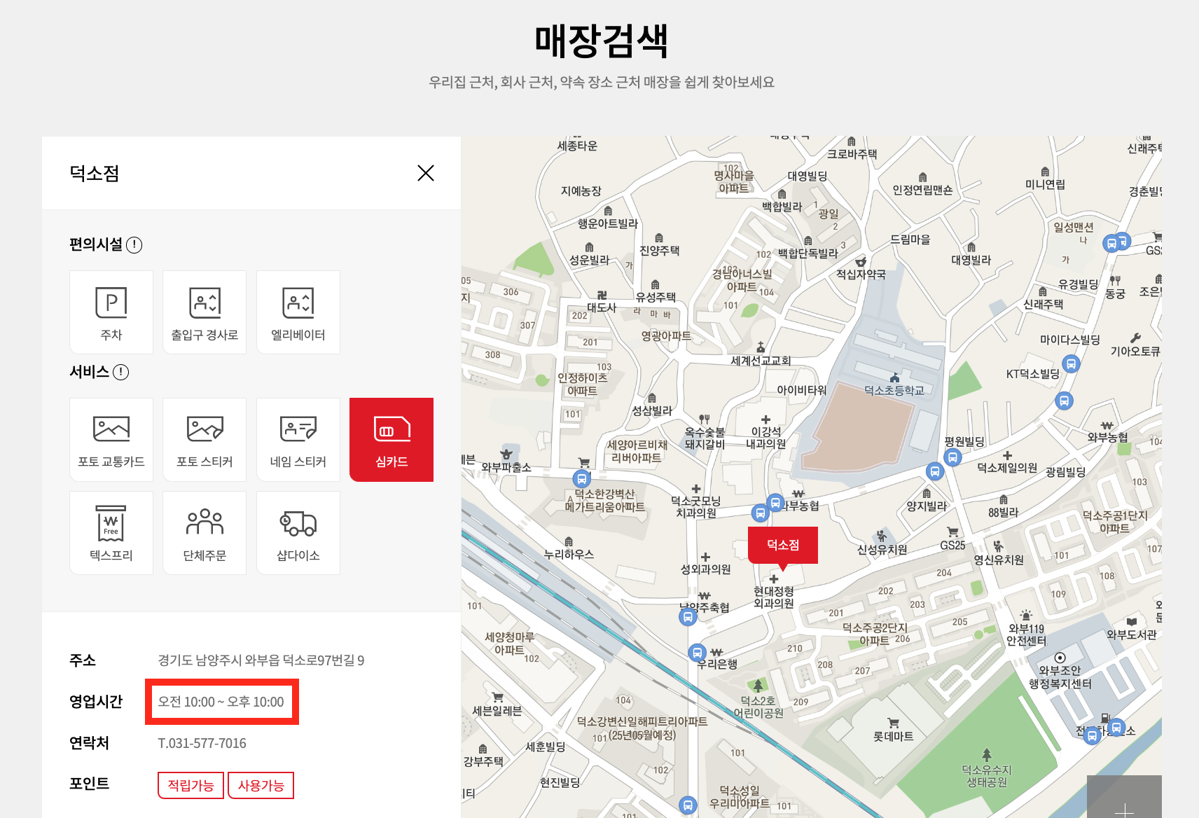 다이소는 일반적으로 오전 10시부터 오후 10시까지 영업을 하는 경우가 대부분입니다. 하지만 매장 특성으로 인하여 시간이 조금씩 바뀔 수 있기 때문에 이는 개별 매장의 정보를 통해 확인하셔야 하는데요. 상단의 매장검색을 하신 후, 해당 매장명을 클릭하시면 아래와 같이 해당 매장의 정보가 나오게 됩니다. 여기에서 각 매장별 영업시간을 확인하실 수 있습니다.