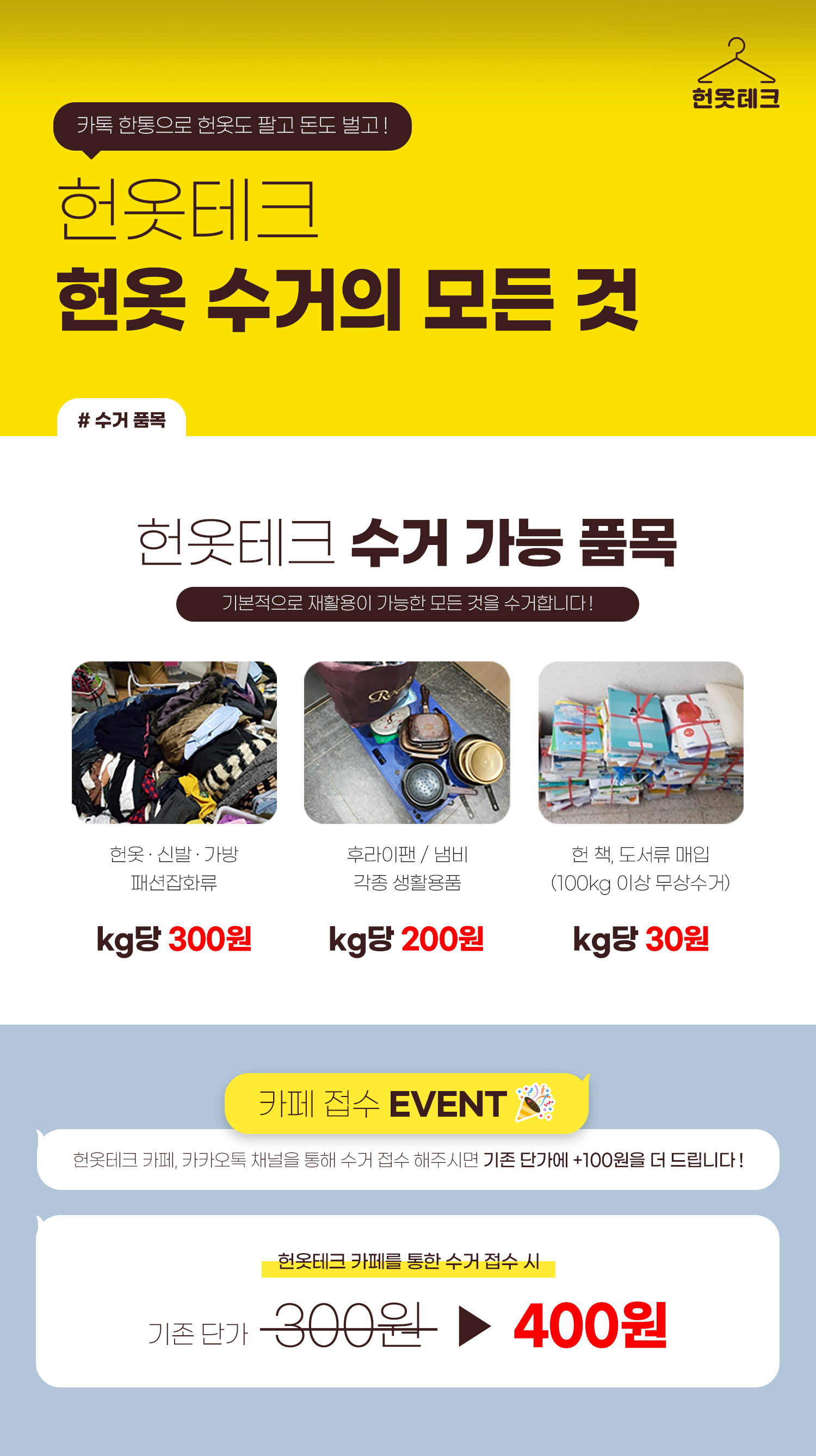 - 매입단가: 헌옷, 신발, 가방, 기타 700원/kg