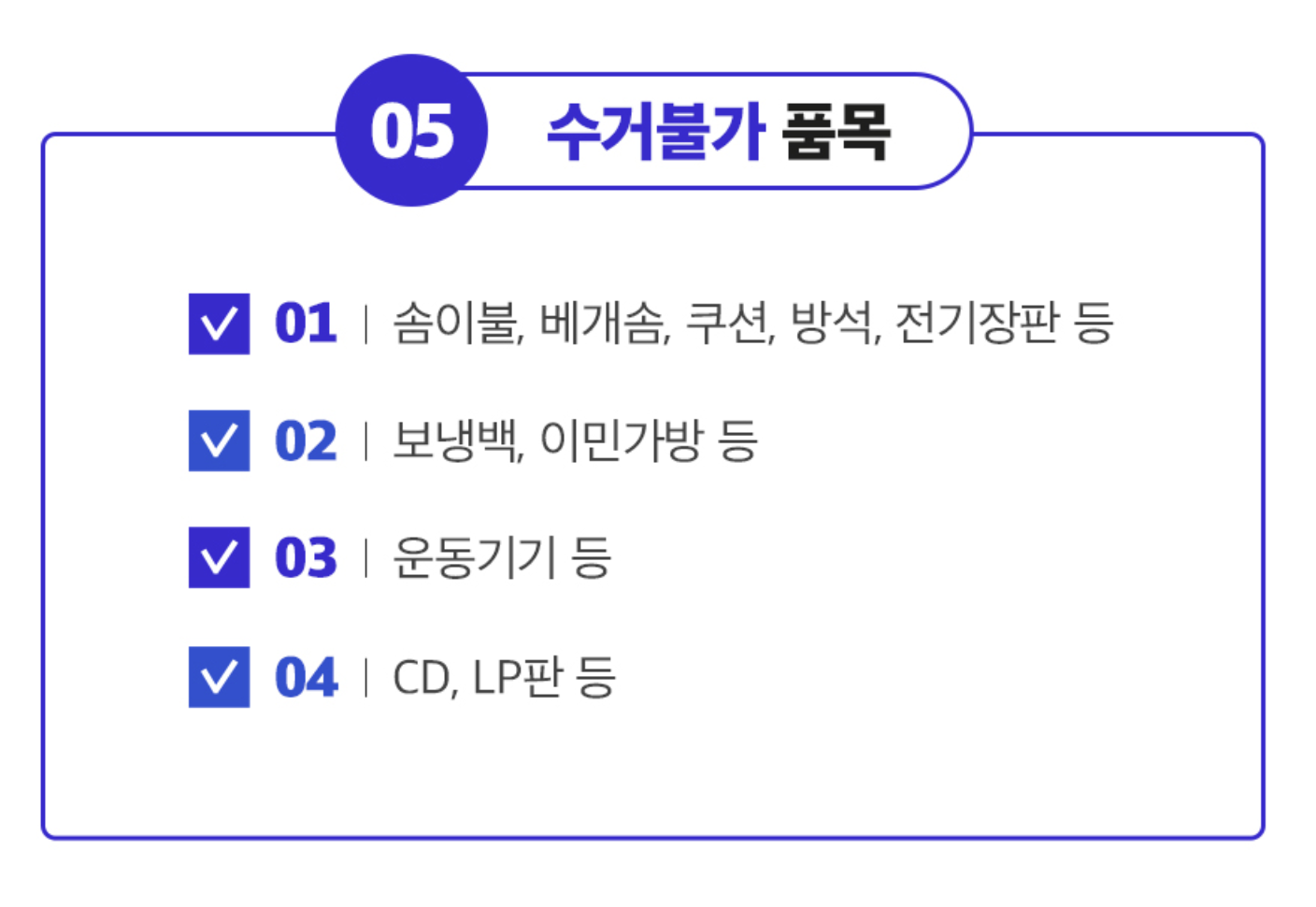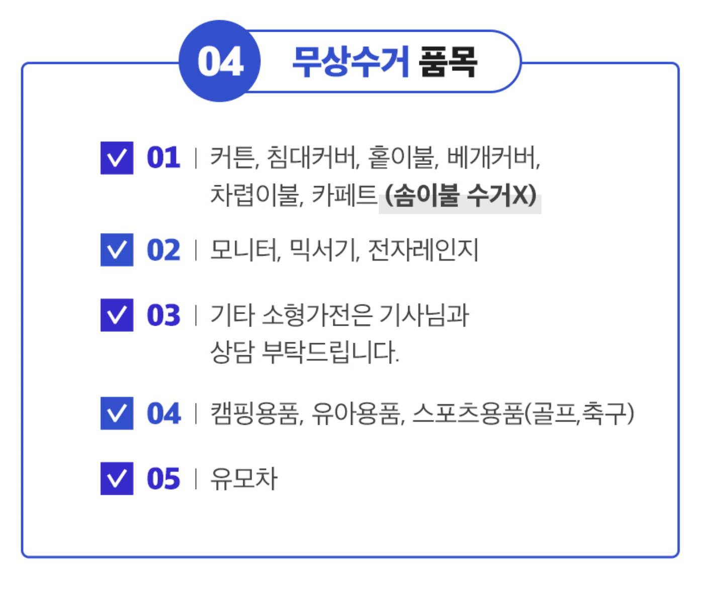 이불의 경우 대부분의 업체가 솜이불을 제외하고는 무상수거품목이므로 업체 방문 시간이나 이불을 제외한 다른 품목 수거여부를 고려하여 업체를 선정하는 것이 좋다.